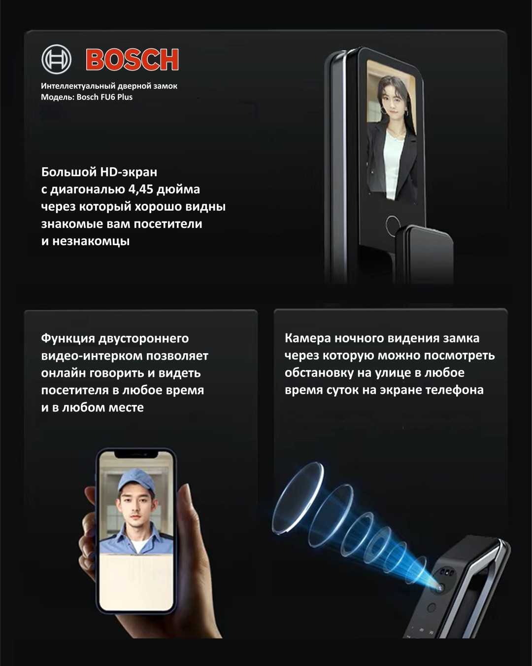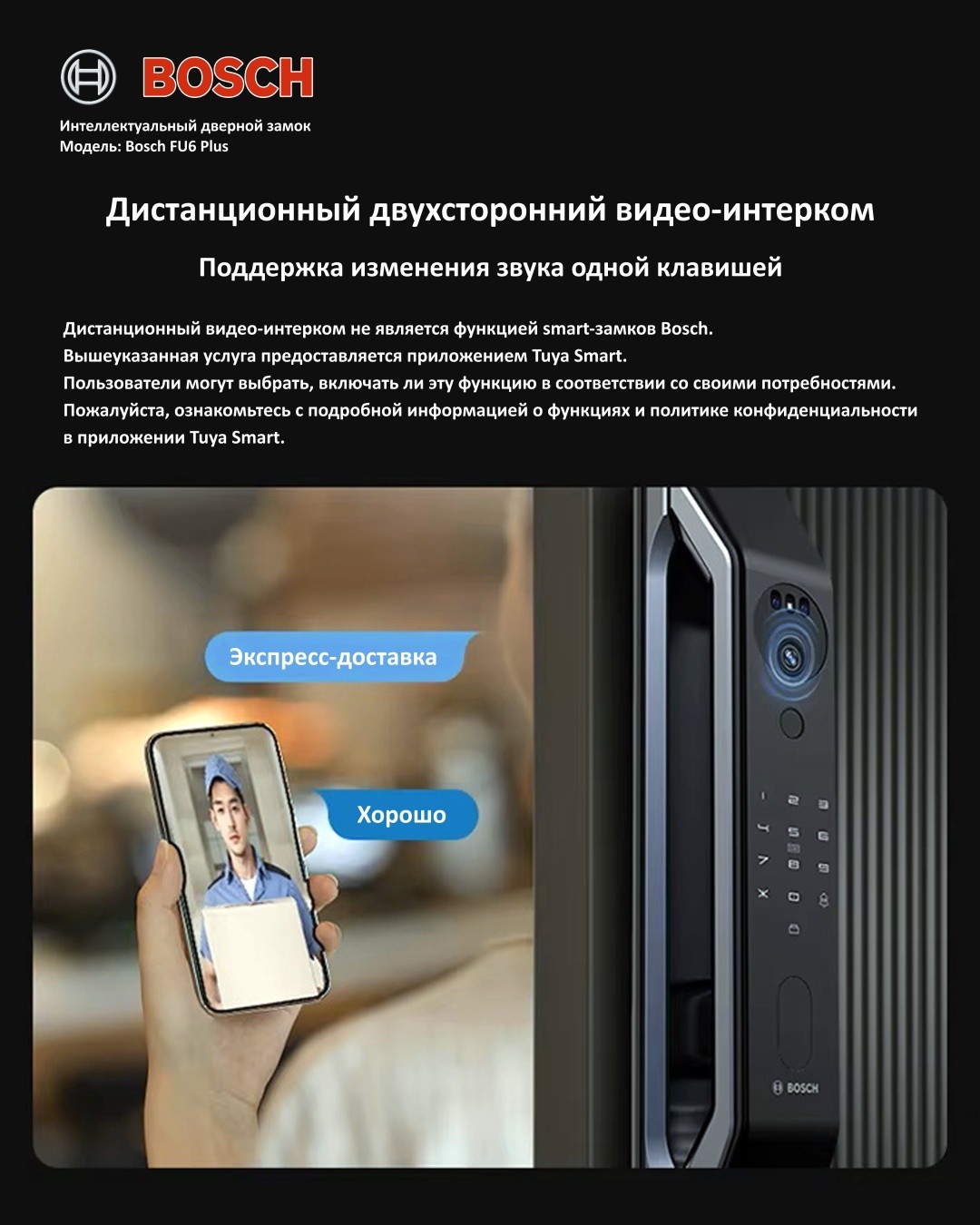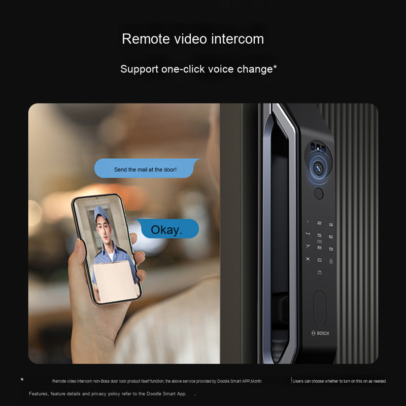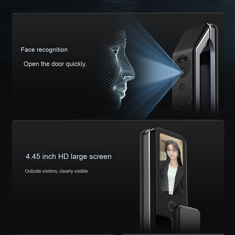 - Функции: сканер отпечатка пальца, автоматическая защелка, автоматическое запирание, встроенная сигнализация, звуковой сигнал, видеокамера, отправка временного пароля